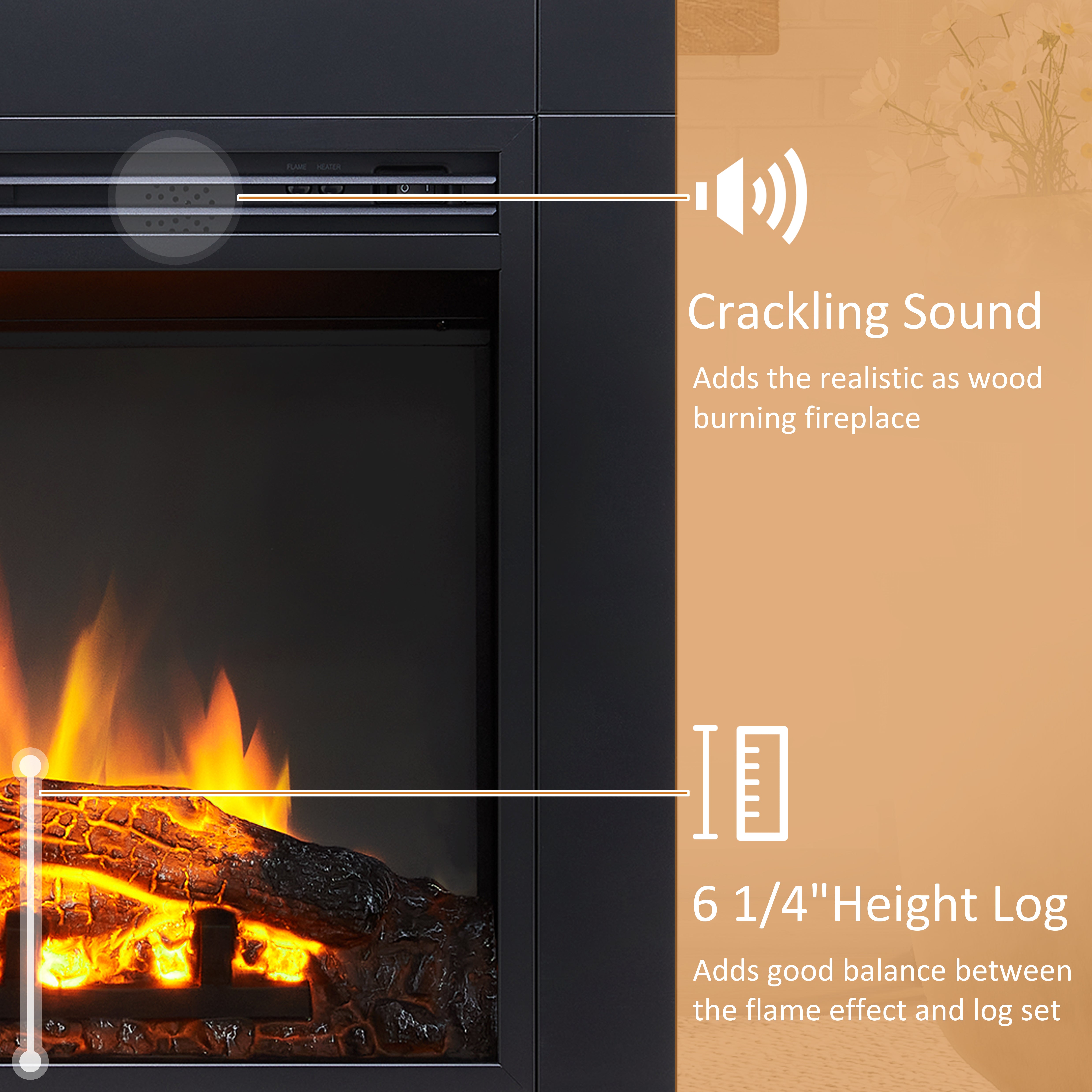 Dimmable LED flame effect and glowing ember effect on logs can be used with or without heater, built-in speaker simulating the sound of charcoal cracking give you a real fireplace experience.