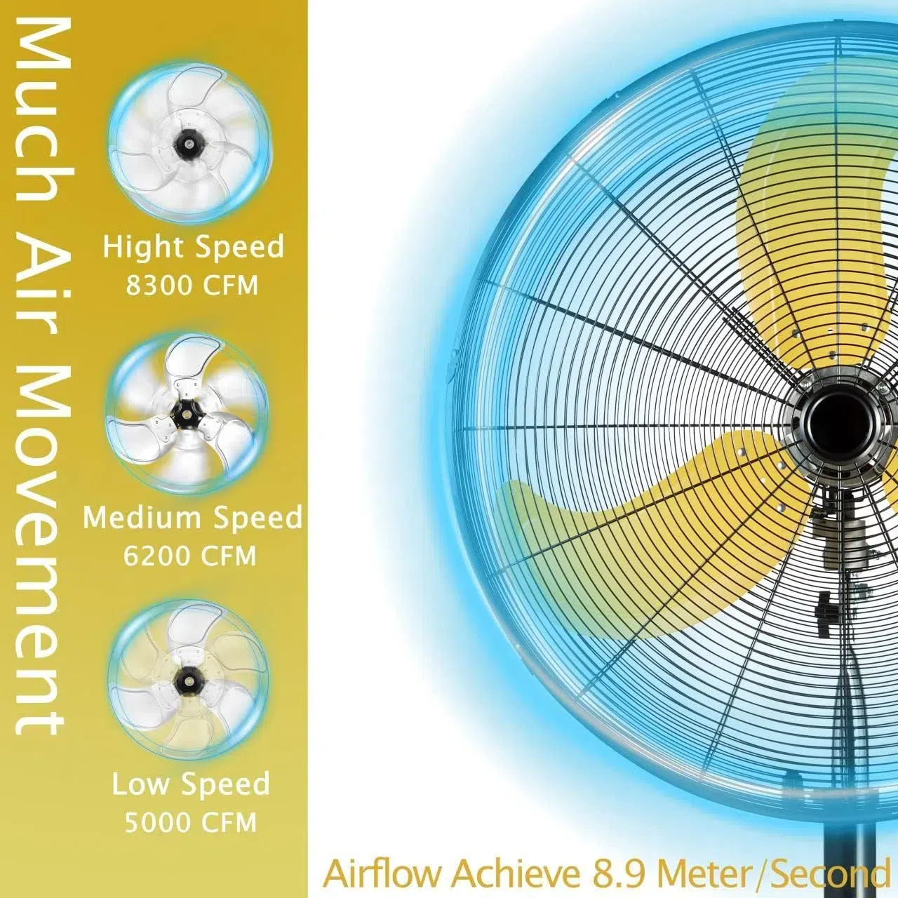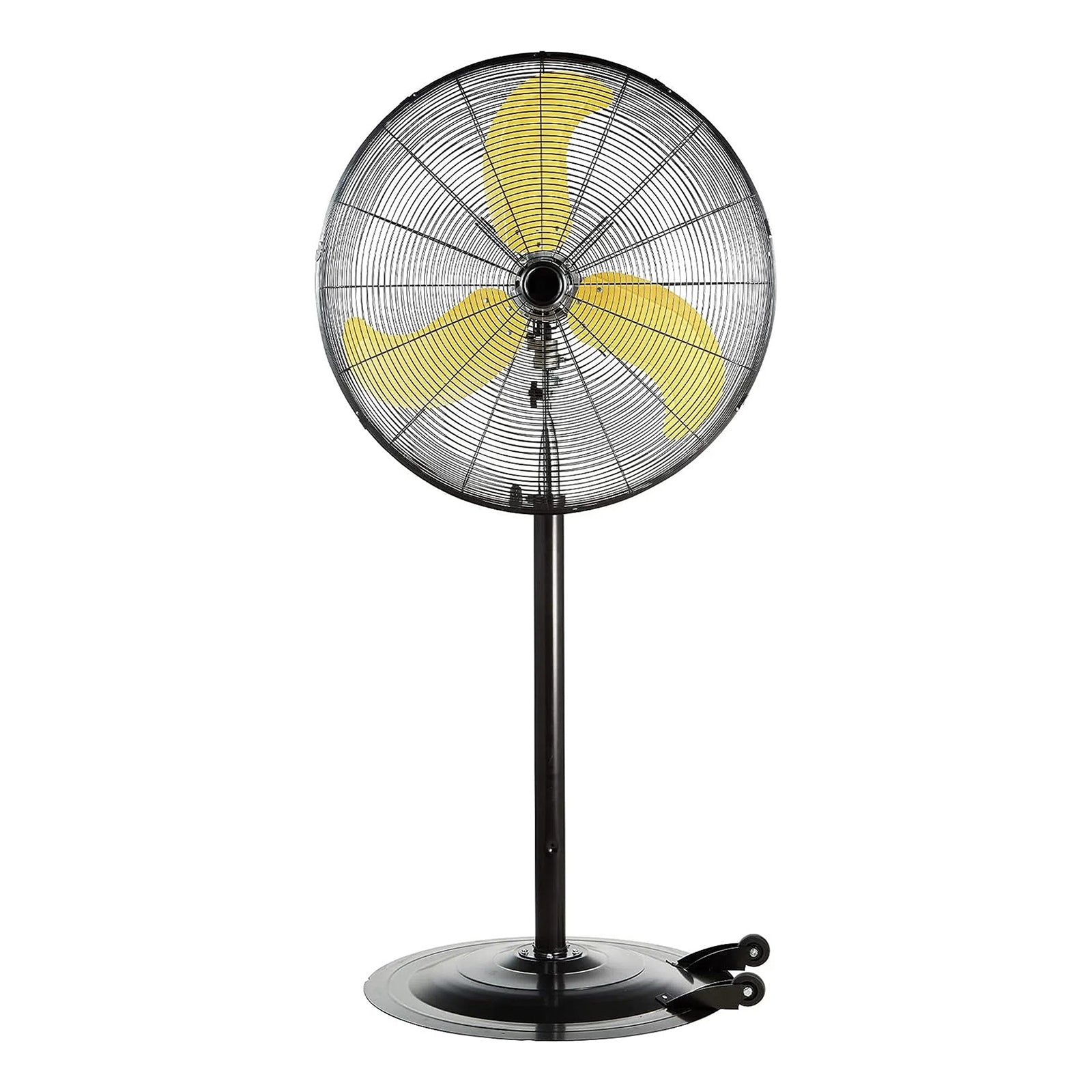 This is a serious shop fan and 100% heavy-duty, industrial quality. It is considerably quieter than similar fans I've used -only a little louder than my 24" pedestal house fan. It is quite heavy and should not be placed on any firm, finished floor or it could damage the finish with its metal base. It has 3 speeds, oscillates at 80 deg and has a tilt feature of 15 deg. It moves a serious amount of air and works best in open spaces. It works very well in my oversized three-bay garage! This is a solidly built fan -all metal where it counts. The fan requires a fair amount of assembly and does not include the necessary tools but it does assemble easily with common household tools. My only concerns are minor and are: the oscillation feature is turned on/off by removing a bolt and repositioning a metal link -easy enough but a switch or at least a screw would be easier, however, the bolt is sturdier so will outlast a screw. I wish the wheels were larger so the fan would not require being leaned down so far to move without the base touching the floor. The 9' cord is much appreciated but because this fan is so tall, about half of the cord just extends from the motor housing to the floor; a 12-15' cord would have been more convenient. The instructions omit a small fact that when securing the back of the fan cage, it must be positioned so the small hole in the flange is down, otherwise it will not align with the hole on the front of the cage and you won't be able to secure the only screw -it is otherwise secured soundly with sliding fasteners. Overall, this is a respectable fan and a great accessory for any shop or outdoor type environment where moving air is beneficial. I enthusiastically recommend this fan!