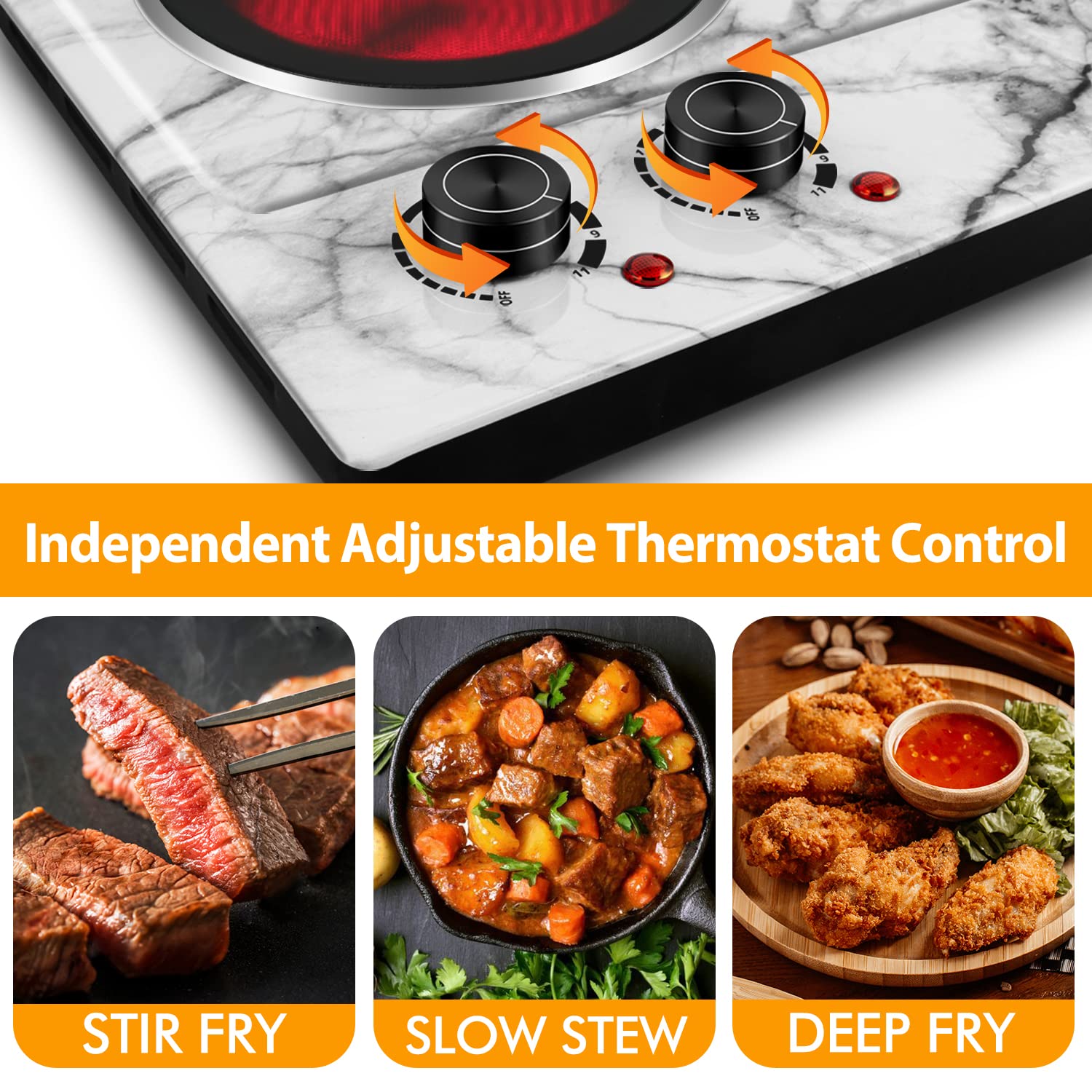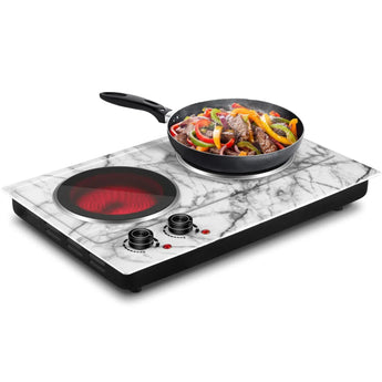 Ceramic double cooktop is powered by 120-Volt and 900-Watt (left panel) plus 900-Watt (right panel), totaling 1800-Watt ood can be heated quickly and evenly, which saves energy compared to gas.