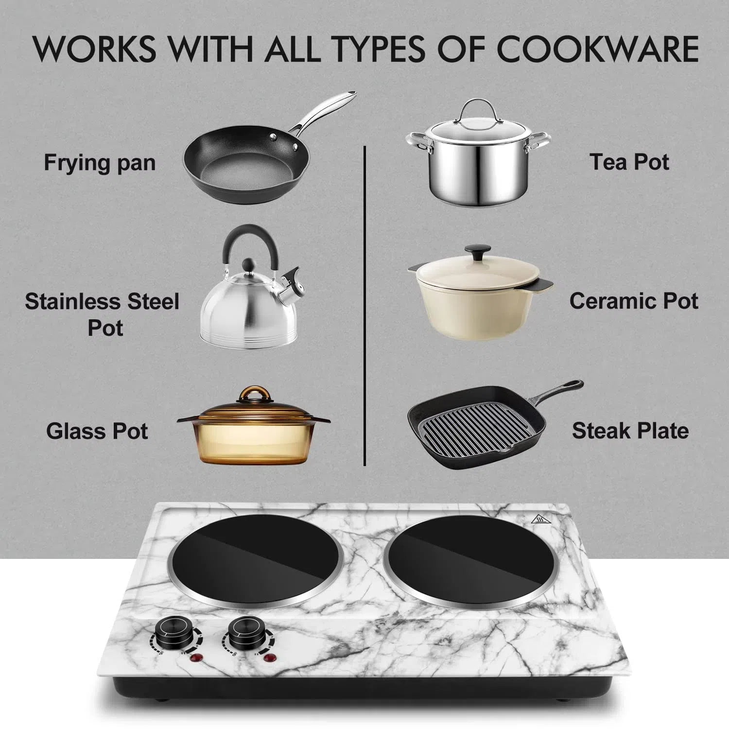 Suitable for all type of cooker pots and pans ranging to 7.1 inches plus 7.1 inenes including glass and aluminum and heats cookware efficiently with minimal heat loss.