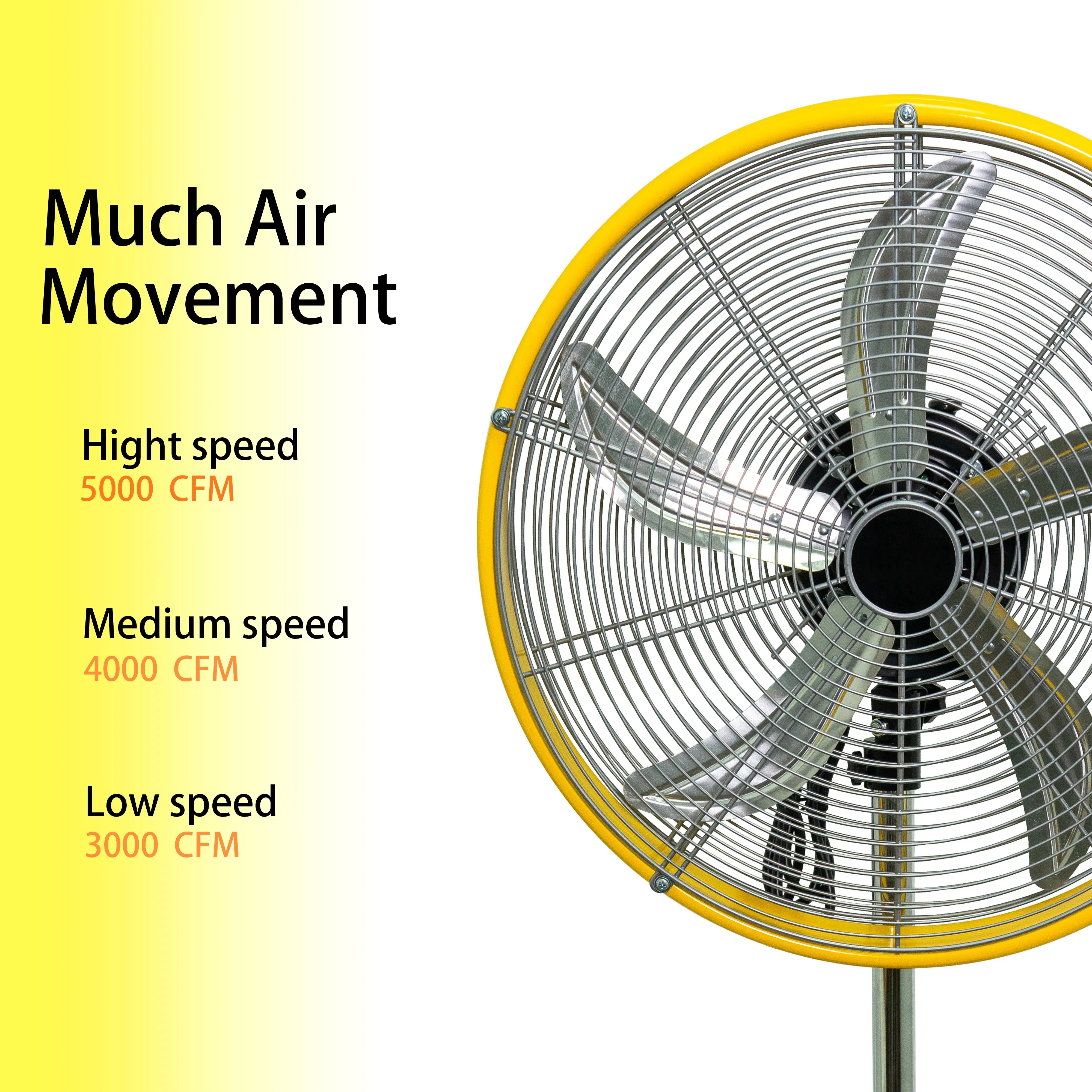 Built with 1/5HP Powerful Motor and Turbo Aluminum Blades, this heavy duty pedestal fan provides refreshing breeze for large spaces. High speed 5000 CFM / Medium speed 4000 CFM / Low speed 3000 CFM. It is ideal for Warehouse, Workshop, Factory, Garage, Basement, Industrial, Commercial and Covered Patio.